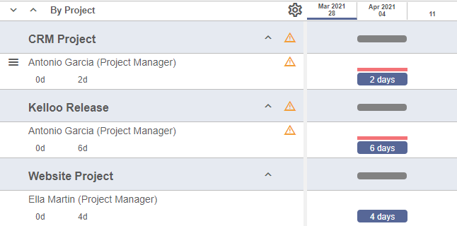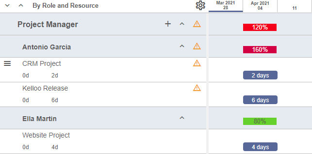 So, if we look at this in priority view. We see that Antonio's work on the Kelloo Release project is flagged as over-allocated.