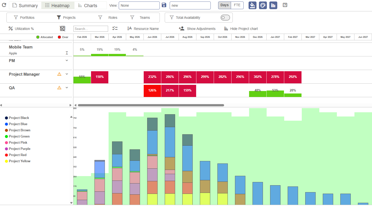 Use the utilization heatmap to understand which resources have too much work (over-allocated) or too little work (under-allocated). The heatmap also shows how much work has been allocated to each resource and their underlying supply.