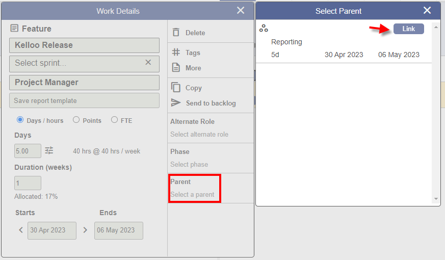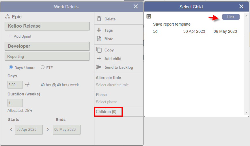 Create parent child relationships to represent things like epics and their associated features or parent tasks and sub tasks. You can only link to work within the same project.