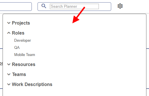 - Select a project - the planner will filter to include only the roles, resources and teams assigned work in the project.